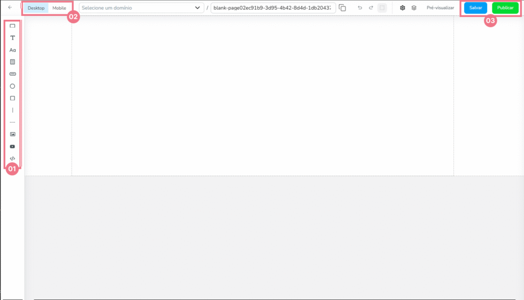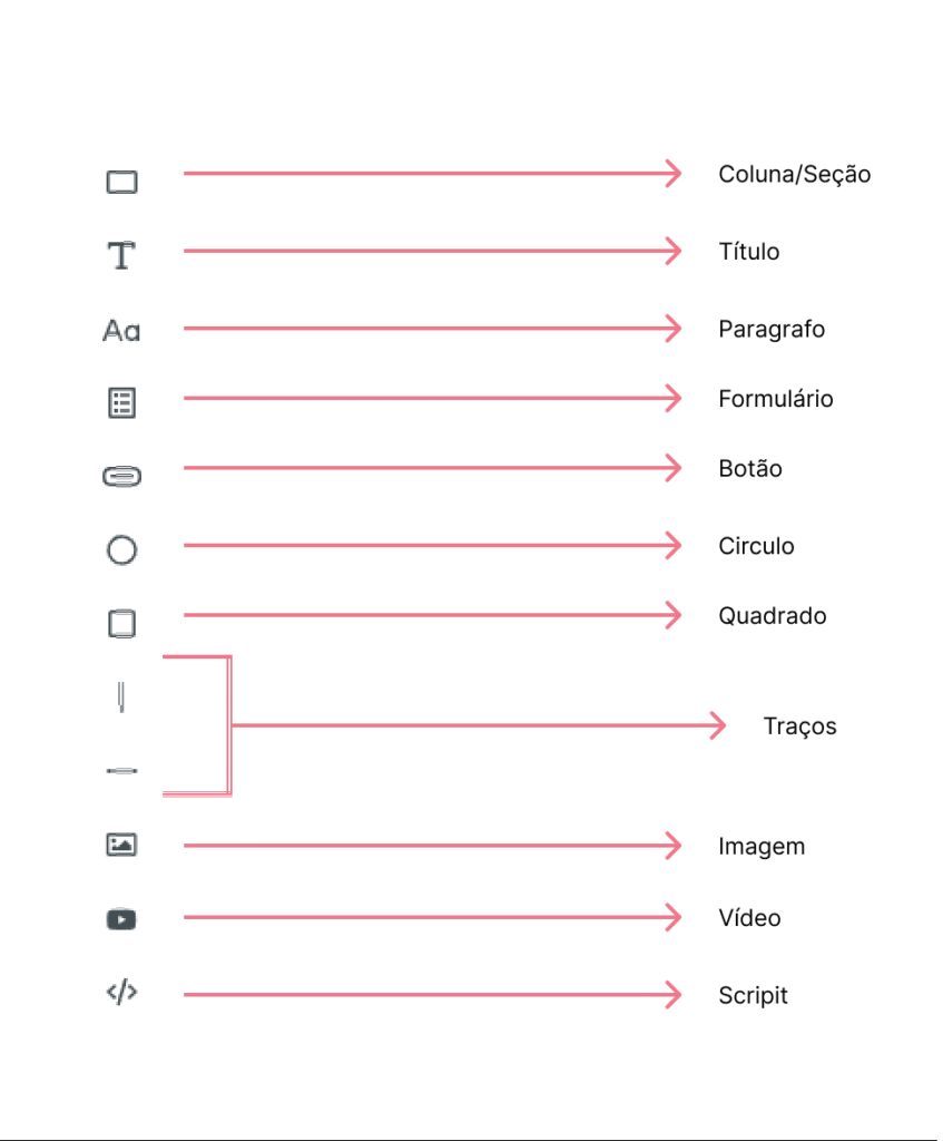 - Ferramentas de componentes da página — aqui você pode adicionar textos, imagens, formas, formulários, entre outros.