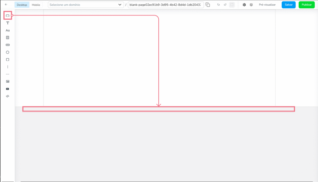 - Representado pelo símbolo de retângulo, esse recurso serve para criar novas seções na sua página. Ao iniciar um template em branco, você perceberá que existe apenas uma seção disponível. Para adicionar outra, arraste o ícone de retângulo até a parte inferior da seção já existente. Assim, uma nova seção será criada automaticamente.