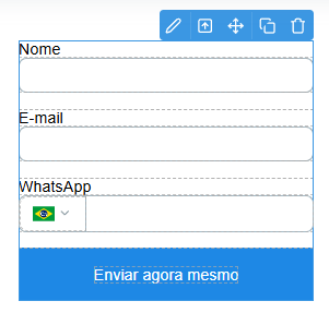 - Para criar um formulário, arraste o componente para dentro da seção já criada. Ao fazer isso, será exibido um formulário padrão com três campos — Nome, E-mail e WhatsApp — além de um botão de envio.