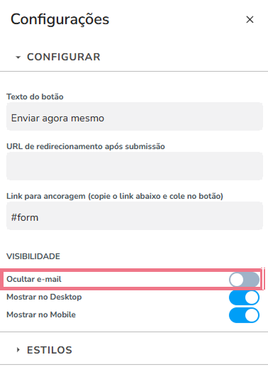 4. Nas configurações de visibilidade, você tem a opção de ocultar o campo de e-mail, deixando no formulário apenas os campos Nome e Telefone.