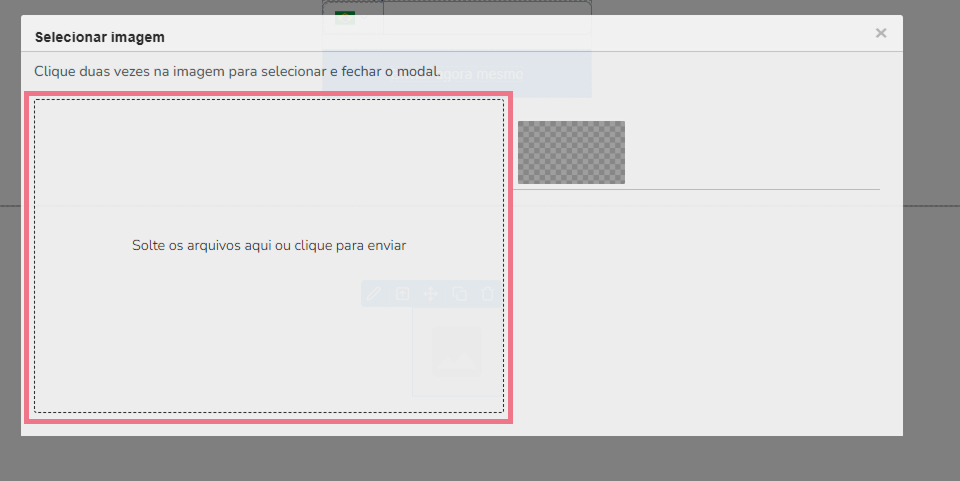 2. Para adicionar uma imagem ao seu template, clique no componente de imagem. Uma janela será aberta, permitindo que você arraste o arquivo ou clique na área destacada para selecionar uma imagem do seu computador.